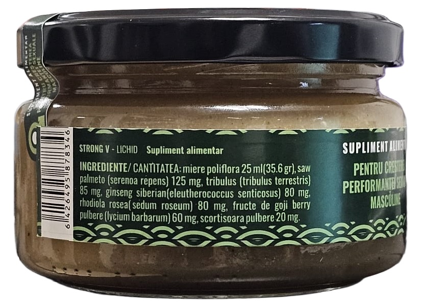 Strong V este un supliment destinat bărbaților, creat pentru a susține și a îmbunătăți potența, fiind o soluție confortabilă și accesibilă. Această miere specială se evidențiază datorită compoziției sale naturale, care nu doar că evită efectele adverse, dar nici nu generează dependență, oferind astfel o experiență eficientă și sigură. Cu un ambalaj de 250 g, produsul este ușor de transportat și ideal pentru a fi utilizat la nevoie.